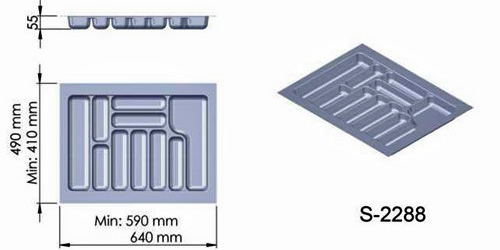 Desetiprohlubňový příborník vyrobený ze stříbrného plastu bez další úpravy, uzpůsobený ke zmenšení rozměrů dle zásuvky uříznutím.