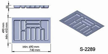 Desetiprohlubňový příborník vyrobený ze stříbrného plastu bez další úpravy, uzpůsobený ke zmenšení rozměrů dle zásuvky uříznutím. S-2289