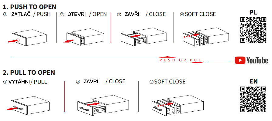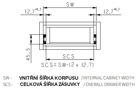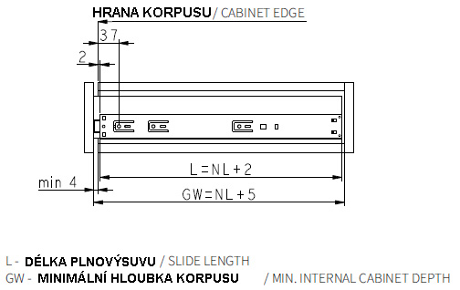 Délka plnovýsuvu je rovna nominální délce uvedené v názvu artiklu, plus 2mm, minimální hloubka korpusu je rovna nominální délce plnovýsuvu. Pro funkci bezúchytkového otvírání PUSH TO OPEN je třeba počítat s vůlí mezi přední hranou korpusu a zadní stranou čela zásuvky, min.4mm.