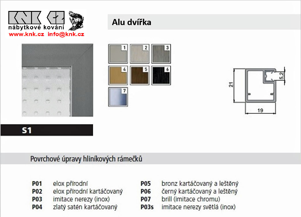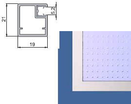 Hranatý úzký rámeček, š.19x21, pohledová hrana 19mm, pro vsazení výplně do tloušťky max. 5,2mm (standardně s těsněním pro výplň 4mm). Nejprodávanější typ. Úchytky doporučujeme vrtat skrz rámeček, 9mm od hrany. Vyžaduje panty pro úzké rámečky. Maximální rozměr rámečku je 2500x600mm, pro rámečky z plochou větší než 0,8m2 je třeba přidat dělící příčku.