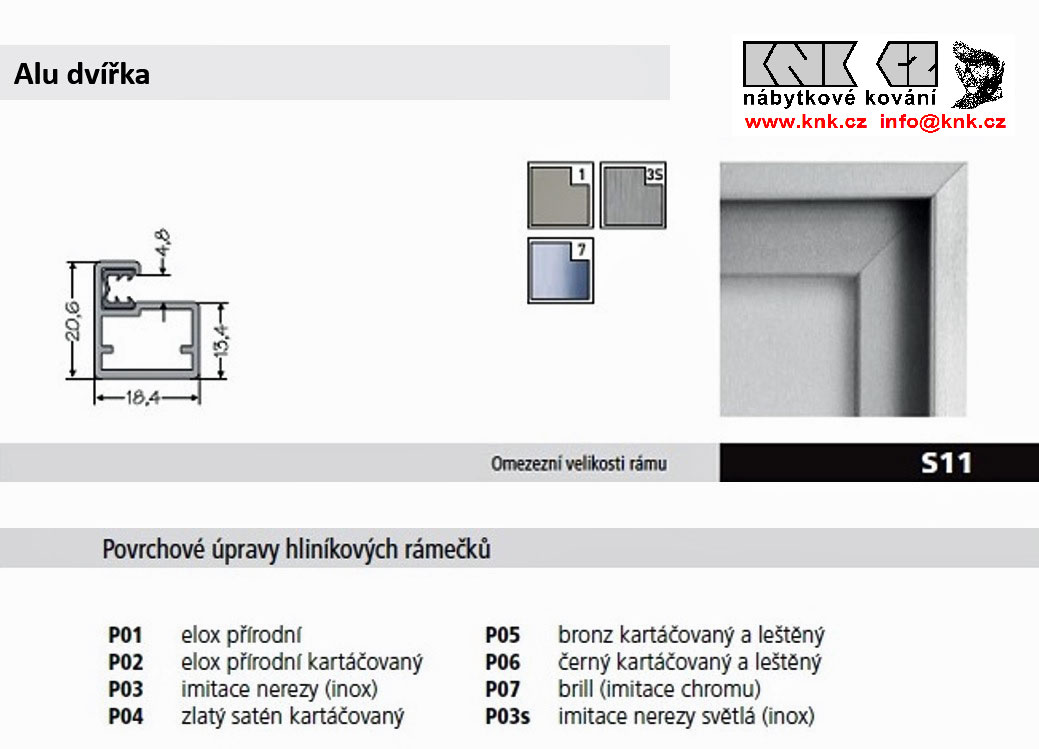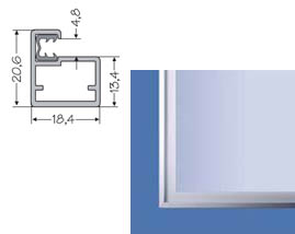 Hranatý úzký rámeček, š.18,4x20,6, s úzkou pohledovou hranou 8mm, pro vsazení výplně do tloušťky max. 4,8mm (standardně s těsněním pro výplň 4mm). Není vhodné použít pro větší dvířka z písty a klopnami, rám se může v místě pantů deformovat. Vyžaduje panty pro úzké rámečky. Maximální rozměr rámečku je 2500x600mm, pro rámečky z plochou větší než 0,8m2 je třeba přidat dělící příčku.