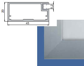 Hranatý široký rámeček, š.45x20, pohledová hrana 45mm, pro vsazení výplně do tloušťky max.5,2mm (standardně s těsněním pro výplň 4mm). Úchytky doporučujeme vrtat skrz rámeček, 9-30mm od hrany. Standardní panty, výklopy, plynové vzpěry jako u DTD dveří. Maximální rozměr rámečku je 2500x600mm, pro rámečky z plochou větší než 1,2m2 je třeba přidat dělící příčku.