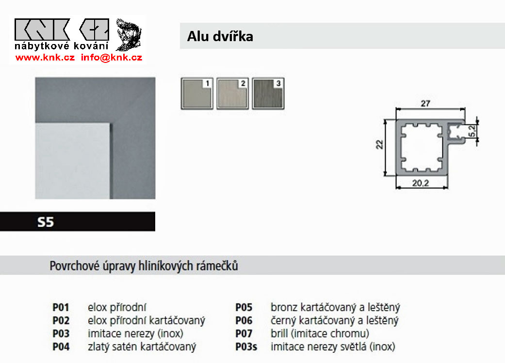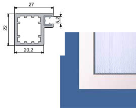 Hranatý úzký rámeček, š.27x22, rozšířená pohledová hrana 27mm, pro vsazení výplně do tloušťky max. 5,2mm (standardně s těsněním pro výplň 4mm).Úchytky doporučujeme vrtat skrz rámeček, 9-13mm od hrany. Vyžaduje panty pro úzké rámečky. Maximální rozměr rámečku je 2500x600mm, pro rámečky z plochou větší než 0,8m2 je třeba přidat dělící příčku.