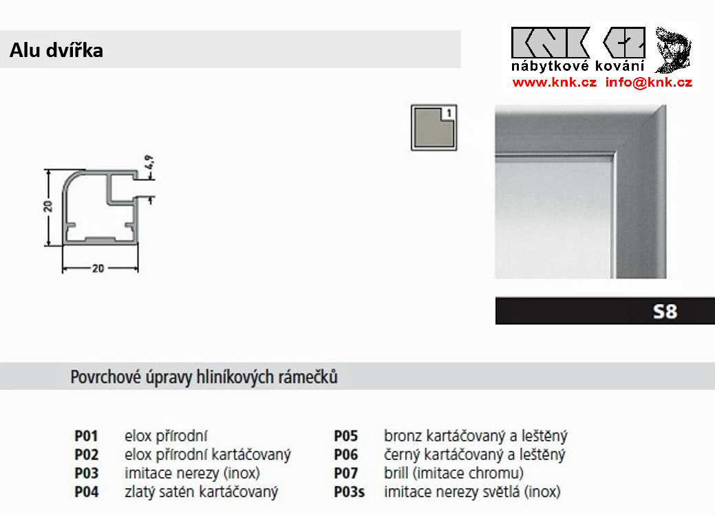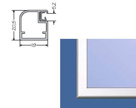Zaoblený úzký rámeček, š.20x20, pohledová hrana 20mm, pro vsazení výplně do tloušťky max. 4,9mm (standardně s těsněním pro výplň 4mm).Úchytky doporučujeme vrtat skrz rámeček, 9mm od hrany. Vyžaduje panty pro úzké rámečky. Maximální rozměr rámečku je 2500x600mm, pro rámečky z plochou větší než 0,8m2 je třeba přidat dělící příčku.
