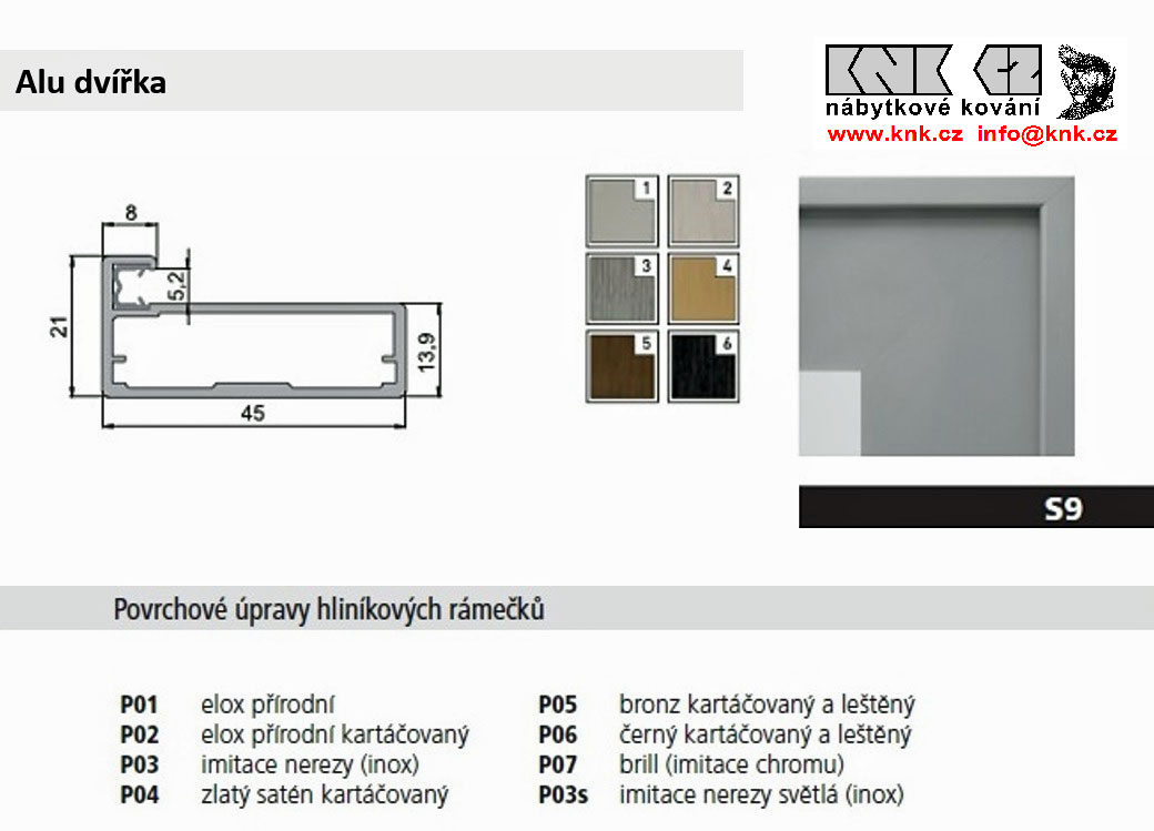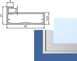 Hranatý široký rámeček, š.45x21, s úzkou pohledovou hranou 8mm, pro vsazení výplně do tloušťky max.5,2mm (standardně s těsněním pro výplň 4mm).Úchytky doporučujeme vrtat skrz rámeček asklo, 20-40mm od hrany. Standardní panty, výklopy, plynové vzpěry jako u DTD dveří. Maximální rozměr rámečku je 2500x600mm, pro rámečky z plochou větší než 1,2m2 je třeba přidat dělící příčku.