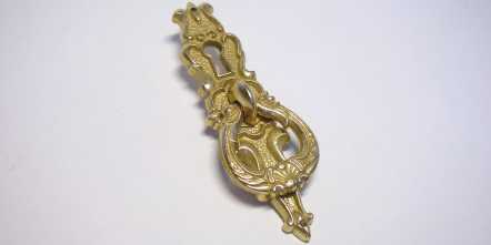 Kód produktu: 00600.16 Dvoudílný sklopný knopek ze slitiny zinku galvanicky pokovený patinou na mědi (pat.) nebo mosazí (Ms), dodávaný včetně šroubku M4. Rozměry: d.34 š.15 v.103 mm