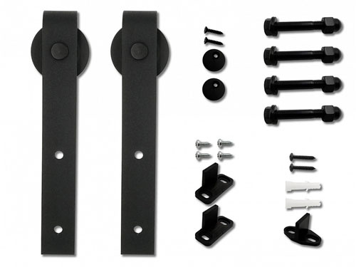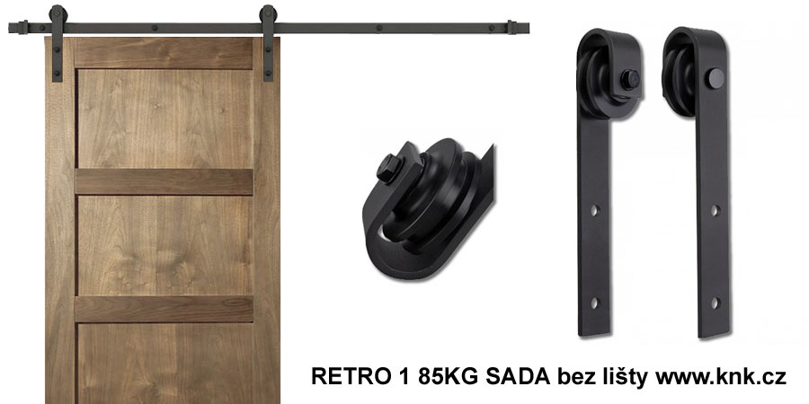 Sada černého interiérového kování s dlouhými závěsy připevněnými z boku, pro jedny posuvné dveře tl.50-60mm, do hmotnosti 85kg, včetně spojovacího materiálu. Sada obsahuje 2x jezdec s kuličkovým ložiskem, 4x šroub s maticí a podložkami, 2x pojistka vysazení, 2x vodítko krajní, 1x vodítko středové, 1x návod k montáži, spojovací materiál pro připevnění vodítek. RETRO lišta (dostupné délky 2x1 a 2x1,5m), tlumič ani úchytka není součástí sady.