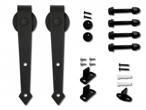 Sada černého interiérového kování s dlouhými špičatými závěsy připevněnými z boku, pro jedny posuvné dveře tl.50-60mm, do hmotnosti 85kg, včetně spojovacího materiálu. Sada obsahuje 2x jezdec s kuličkovým ložiskem, 4x šroub s maticí a podložkami, 2x pojistka vysazení, 2x vodítko krajní, 1x vodítko středové, 1x návod k montáži, spojovací materiál pro připevnění vodítek. RETRO lišta (dostupné délky 2x1 a 2x1,5m), tlumič ani úchytka není součástí sady.