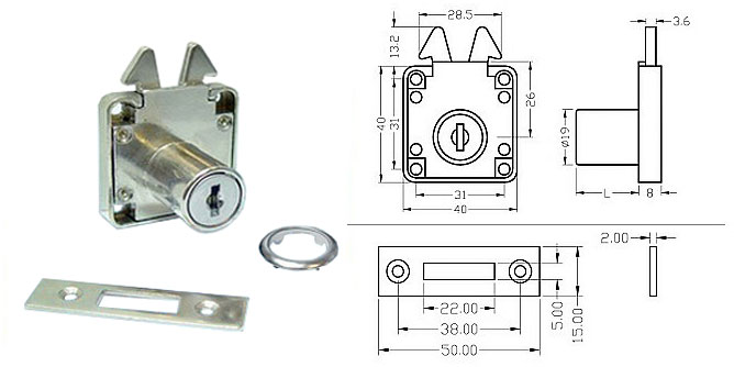 Celokovový roletový zámek, galvanicky pokovený, dodávaný v krabičce včetně dvou kusů cylindrických klíčků a protiplechu k zadlabání.