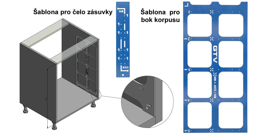 Univerzální sada 2ks ocelových lakovaných šablon, šablona pro předvrtání otvorů k montáži zásuvek AxisPro a Modernbox, do bočnic korpusů skříňky standardní výšky 720mm a vrtací šablona pro předvrtání čílka zásuvky vysokého 140 či 284mm (pro naložení čílka na bok 16mm).