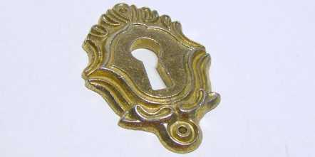 Kód produktu: 04500.16 Ozdobný štítek pro klíčovou dírku ze slitiny zinku, galvanicky pokovený patinou na mědi (pat.) nebo mosazí (Ms). Rozměry: d.33 š.3 v.45 mm