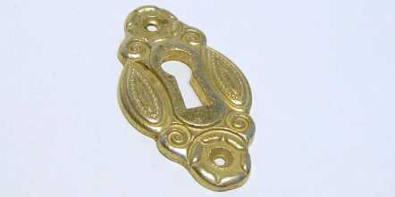Kód produktu: 04100.16 Ozdobný štítek pro klíčovou dírku ze slitiny zinku, galvanicky pokovený patinou na mědi (pat.) nebo mosazí (Ms). Rozměry: d.28 š.3 v.50 mm