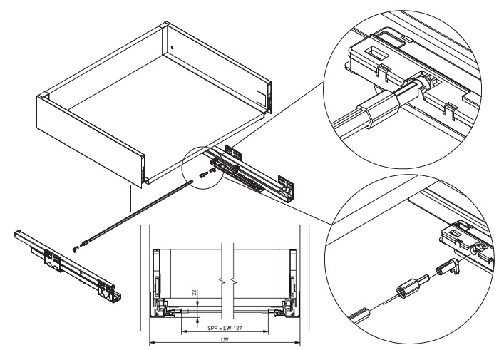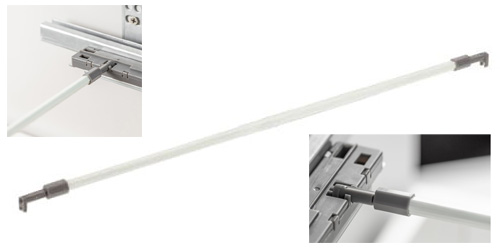 Synchronizační sada, kompozitová tyč délky 1200mm, se čtyřmi sety adaptéru a koncovky, pro stabilizaci širokých zásuvek GT PUSH AXISPRO BOX s bezúchytkovým otvírání. Slouží ke spojení levé a pravé části mechanismu pojezdu zásuvky AxisPro, čímž je zajištěn synchronní pohyb obou stran zásuvky při otvírání i zavírání a ovládání zásuvky pomocí stisku na libovolném místě čela. Tyč je třeba zkrátit (uříznout), dle požadované šířky zásuvky. Potřebná délka tyče je o 127mm menší, než je světlá šířka korpusu pro zásuvku, maximální šířka jedné zásuvky, pro použití se synchronizační tyčí, je tedy 1327mm. Jelikož sada obsahuje čtyři sety koncovek s adaptéry, u zásuvek do šířky cca 700mm je možno použít jednu sadu pro dvě zásuvky.