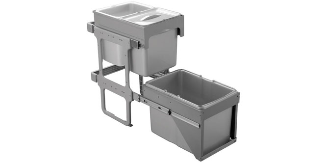 Dvoupatrový sorter s pevnou a bezúdržbovou laminátovou konstrukcí a pojezdy o nosnosti 30kg. Spodní patro s jednou nádobou 34l vysouváno připojenými dvířky, horní patro se dvěma nádobami 16l k ručnímu vysouvání. K zabudování do spodní kuchyňské skříňky, široké 400mm, montáž do dna korpusu a k bočním stěnám. Cena zahrnuje montážní sadu + 1x víko na směsný odpad (pro nádobu 16l).