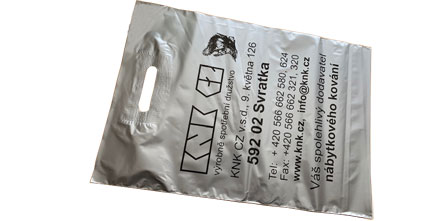 Stříbrná PE taška rozměru 350x500mm s podvarem zesílenými výsekovými uchy a jednostranným černým potiskem.