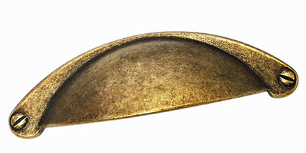 Celokovová úchytka typu mušle ze slitiny zinku galvanicky pokovená odstínem stará mosaz, balená v PE sáčku bez šroubků M4 pro uchycení.