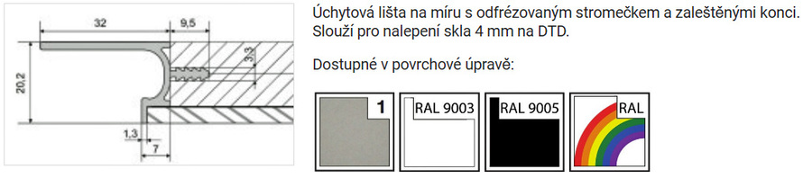 Úchytkový profil na míru UKW-16 - pro nalepení skla tl.4mm na DTD
