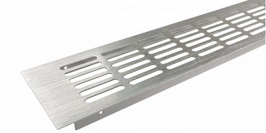 Podélná kovová větrací mřížka vyrobená ze slitiny hliníku, povrchově upravená imitací podélně broušené nerezi, k naražení do otvoru v.87x370mm.