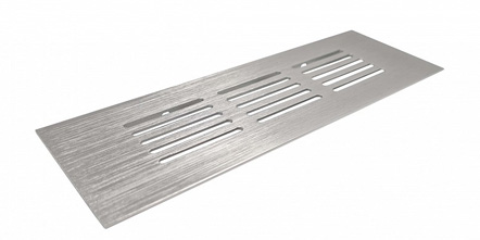 Podélná kovová větrací mřížka vyrobená ze slitiny hliníku, povrchově upravená imitací podélně broušené nerezi, k naražení do otvoru v.33x120mm.