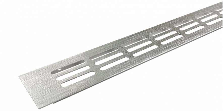 Podélná kovová větrací mřížka vyrobená ze slitiny hliníku, povrchově upravená imitací podélně broušené nerezi, k naražení do otvoru v.45x220mm.