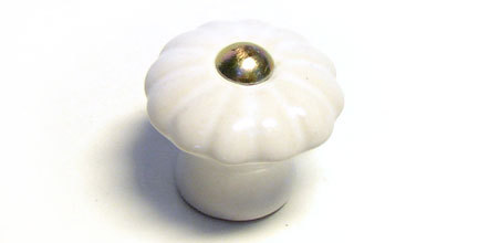 Kombinovaný dvoudílný knopek z keramiky a ocelového šroubu, glazovaný lesklou bílou glazurou, s galvanicky pokovenou kovovou částí. Ruční malosériová výroba v České republice.