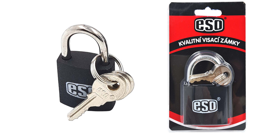 Visací zámek ESO ze slitiny železa s povrchovou úpravou černý mat. a šířkou těla 25mm. Zamykání pouhým zacvaknutím třmenu pr.4mm do těla zámku. K zámku jsou dodávány 3 klíče. Zámek je balen v plastovém blistru s papírovou kartou. Balení je opatřeno eurovýsekem pro možnost zavěšení. Produkt určen pro maloobchodní prodej - bez možnosti velkoobchodních slev.