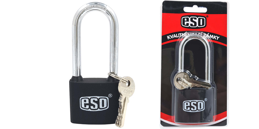 Visací zámek ESO ze slitiny železa s povrchovou úpravou černý mat. a šířkou těla 50mm, HARDENED třmen pr.8mm zámku je vybaven pryžovými kroužky. Ty výrazně snižují negativní působení povětrnostních vlivů na tělo zámku. Zamykání pouhým zacvaknutím třmenu do těla zámku. K zámku jsou dodávány 3 klíče. Zámek je balen v plastovém blisteru s papírovou kartou. Balení je opatřeno eurovýsekem pro možnost zavěšení. Produkt určen pro maloobchodní prodej - bez možnosti velkoobchodních slev.