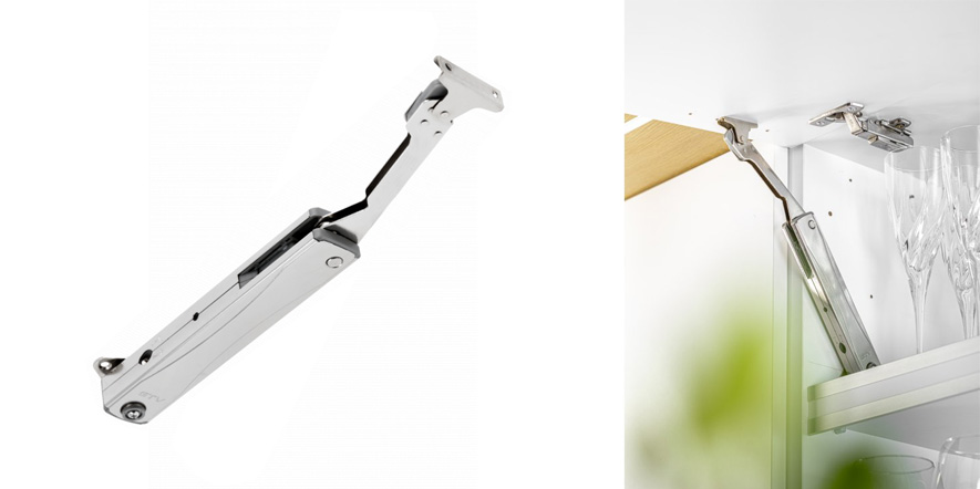 Mechanický výklop jako moderní designová náhrada plynové vzpěry, v barvě lesklého chromu či černé. Pro vyklápění dvířek výšky 300-450mm, šířky 500-1000mm, například horních skříněk kuchyní, o hmotnosti 3,5-4,5kg (5,5-7,5kg při použití dvojice výklopů). Úhel otevření 100°, plynulá regulace síly otevření šroubem.