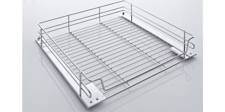 Provedení koše s drátěným dnem. Na připevnění koše do skříně jsou nutné výsuvy označené VK.BLUM.480 s tlumením nebo VK.HETTICH.480.T s tlumením, které nejsou součástí výrobku a objednávají se samostatně.