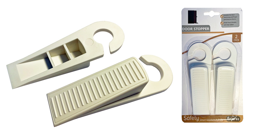 Pár gumových dveřních zarážek tvaru klínu v barvě bílé či hnědé, používaných pro dočasnou aretaci dveří v požadované poloze a například jako ochrana před přibouchnutí dveří dětmi či průvanem. S háčkem k případnému zavěšení zarážky na kliku dveří. Baleno v blistru 111x217x30mm, po 2ks.