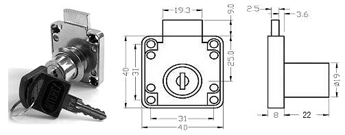 Kód produktu: 101302.03 Celokovový zásuvkový zámek galvanicky pokovený, dodávaný v krabičce včetně dvou kusů cylindrických klíčků. Stený uzávěr - jednotný klíč. Rozměry: d.40 š.30 v.40