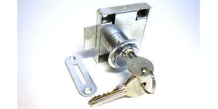Kód produktu: 101500.03 Celokovový zásuvkový zámek galvanicky pokovený, dodávaný v krabičce včetně tří kusů cylindrických klíčků. Rozměry: d.56 š.31 v.47