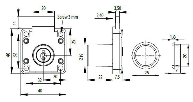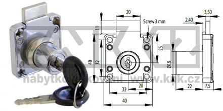 Celokovový zásuvkový zámek galvanicky pokovený, dodávaný v krabičce včetně dvou kusů cylindrických klíčků.