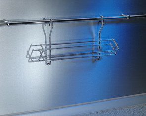 Kód produktu: K 054 BK 30.80 Drátěná polička jednostupňová, vyrobená z galvanicky chromované oceli, pro uložení šesti kořenek, k zavěšení na relingové madlo. Rozměry: d.365 š.104 v.203 mm